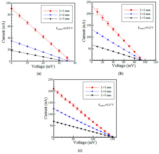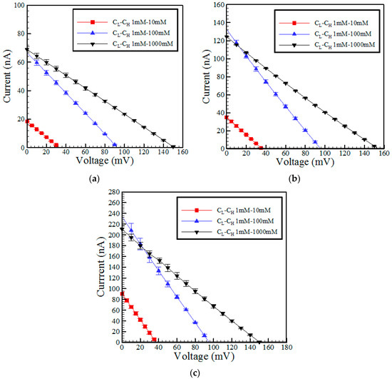 Figure 4a–c show the measured I-V curves of the three RED devices with different microchannel lengths given KCl concentration ratios of 10:1, 100:1 and 1000:1 (mM), respectively. It is seen that for all values of the concentration ratio, the channel resistance (R = V/I) reduces with a reducing microchannel length. As a result, the power generated by the RED device reduces as the microchannel length increases.
