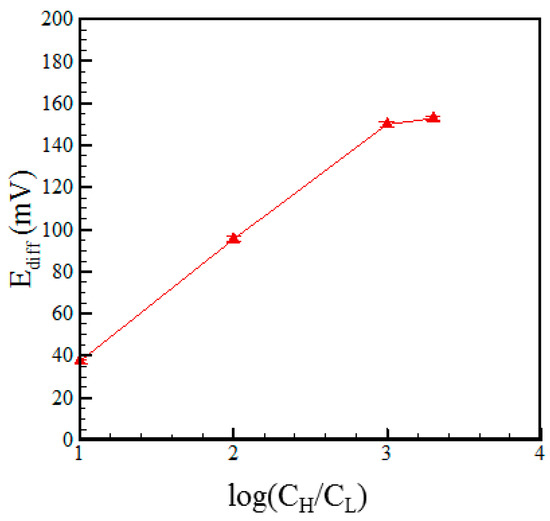 Figure 3a shows a schematic illustration of the RED process in the proposed device. As shown, the left (anode) and right (cathode) reservoirs are filled with high- and low-concentration KCl solutions, respectively. As a consequence, a salinity gradient is formed along the length of the microchannel. Due to the ion-selectivity of the membrane, the cations and anions diffuse toward the low-concentration reservoir at different rates. Consequently, a difference in the positive and negative charges is produced at the two ends of the membrane. This difference results in the formation of a diffusion potential, which is subsequently converted into electrical energy through a process of reverse electrodialysis. Figure 3b shows the equivalent electrical circuit for the experimental setup used to evaluate the performance of the proposed RED device. Note that Vapp is the potential applied by the source meter; Eredox is the potential produced by the redox reactions at the electrodes; Ediff is the diffusion potential; Rchannel is the resistance of the microchannel filled with Nafion; and I is the output current generated by the microchip. The redox potential produced at different concentration ratios (CH:CL) can be expressed by the following Nernst relation [24,25]: