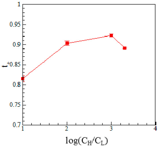 Variation of transference number with the concentration ratio given a microchannel length of 1 mm.