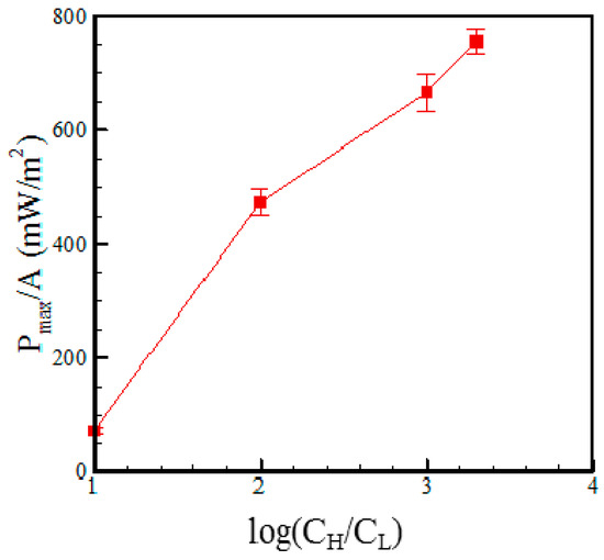 Most of today’s energy is produced from fossil fuels (e.g., coal, oil and natural gas). However, this has serious implications for the environment, including most notably, the emission of greenhouse gases (CO2, SO2 and NOx) and global warming. To address the problems of environmental pollution and climate change and to prevent future resource depletion, it is necessary to develop alternative green energy sources, such as salinity gradient energy [1,2,3], biomass conversion [4], wind power [5], solar energy [6], and others. Of these various technologies, salinity gradient energy is one of the most attractive since seawater accounts for almost 70% of the planet’s surface. In the salinity gradient method, power is generated from the Gibbs free energy produced during the mixing of seawater and fresh water. The method was first proposed by Weinstein and Leitz [7] and has an estimated theoretical output capacity of up to 1.4–2.6 TW [8]. Suda et al. [9] investigated the performance of a dialytic battery consisting of 59 compartments made with 29 ion-exchange membrane pairs, each with an effective area of 80 cm2 per sheet. The results showed that while the output power reduced over time, a power density of 259 mW/m2 was possible during the initial mixing of seawater and river water. Veerman et al. [10] showed that for a scaled-up reverse electrodialysis (RED) stack consisting of 50 cells with a size of 25 cm × 75 cm, a maximum power density of 930 mW/m2 could be achieved given an appropriate hydrodynamic design of the stack.