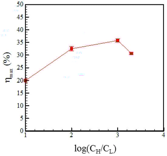 Figure 7 shows the maximum power density (i.e., the maximum power divided by the membrane area) in the RED device with a microchannel length of 1 mm given concentration ratios of 10:1, 100:1, 1000:1 and 2000:1 (mM). It is seen that the maximum power density has a value of 755 mW/m2 and is achieved in the device with a concentration ratio of 2000:1 (mM). By contrast, the highest conversion efficiency is achieved in the device with a concentration gradient of 1000:1 (mM) and is found to have a value of 36%, as shown in Figure 8. Figure 9a–c show the I-V characteristics of the RED devices with channel lengths of 3, 2 and 1 mm, respectively, given three different electrolyte concentration ratios (10:1, 100:1 and 1000:1 (mM)) in each case. It is seen that for all values of the microchannel length, the short circuit current does not monotonically increase as the concentration ratio is increased. This finding can be explained as follows. Since cation migration flux from the high-concentration reservoir to the low-concentration reservoir increases with the concentration ratio, the amount of cations accumulated at the lower concentration reservoir would result in an opposite electrical field to the anode side (see Figure 3a). The opposite electrical field and the cation diffusion flux would therefore counteract and reach an equilibrium condition.
