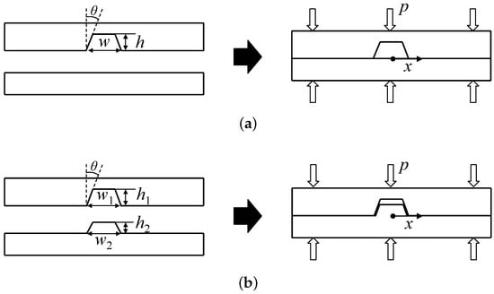 Typically, the bonding strength increases with the applied pressure in the thermal bonding of thermoplastics [14]. Numerical simulation was first performed prior to the experimental implementation of the proposed bonding method to quantitatively analyze the pressure distribution along the contact surface between the two substrates. The numerical simulation involves two-dimensional models as shown in Figure 1. The microchannel width () and height () were fixed to 500 m and 700 m, respectively. Other geometrical parameters of draft angle (θ), micro-rib width () and height () were varied to observe their effect on the pressure distribution. The width and thickness of the substrate were 5 mm and 1 mm, respectively. The process was assumed to be isothermal at 95 °C, and ANSYS software was used to only perform the structural analysis. An elastic modulus of 533 MPa and a Poisson ratio of 0.4 were applied with respect to the material properties of the substrates. A constant pressure was applied at the upper boundary of the upper substrate, while the lower boundary of the lower substrate was fixed. The left and right boundaries of the substrates were constrained such that they did not exhibit any displacement in the lateral direction, and a constant friction coefficient of 0.2 was applied for the contact condition between the two substrates.