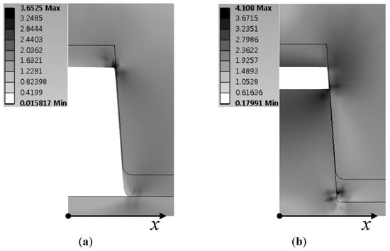 Simulation results of von Mises stress distribution around microchannel (a) without the interference fit and (b) with the interference fit. Applied pressure is 1 MPa. Interference height, width and draft angle are 500 m, 10 m and 4°, respectively.