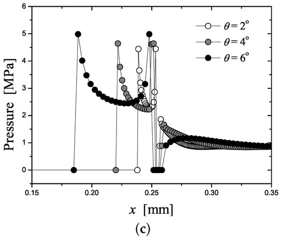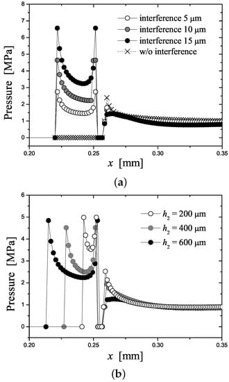 Figure 3b shows the effect of on the pressure distribution when 10 m and . The maximum pressure at the interference region was found to almost independent of , while the average value is almost inversely proportional to . Therefore, when is further increased as m, the average pressure at the interference region is only slightly affected by . From the view point of the process optimization, it would be better if the contact pressure is less sensitive to the geometrical parameter of the interference. In this regard, it is recommended to select the interference height () as at least two times the final microchannel depth (). In contrast, the draft angle θ had only minor effect on the pressure distribution as shown in Figure 3c where 10 m and 500 m were applied. The maximum and average pressure at the interference region is slightly decreased as θ is decreased.