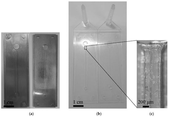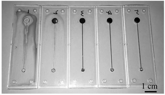 Microfluidic devices can be fabricated from various materials including glass, silicon, and polymeric materials [8,9]. Poly-dimethylsiloxane (PDMS) is the most common material used for the fabrication of microfluidic devices in the laboratory, as it allows simple replication and sealing procedures. Furthermore, advantages of PDMS, such as biocompatibility, high gas permeability, and superior optical transmittance, are required in many cases for biomedical applications. However, the issue of a long fabrication time is a disadvantage of PDMS; thus, it is difficult to use PDMS as a material for several practical applications.