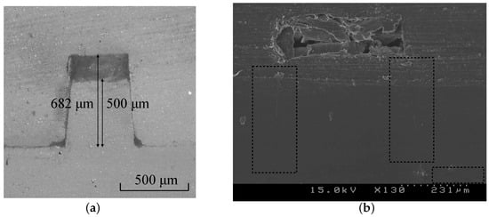 Cross-sections of the bonded products were observed to investigate the effect of the bonding condition on the final shape of the microchannel. Figure 7 shows the product bonded at 2.0 MPa and 95 °C. The micro-rib was retained securely without significant deformation. The microchannel only exhibited a slight deformation, and its depth was 682 m. Figure 7b presents the scanning electron microscope (SEM) micrograph to confirm the bonding along the contact region. The other products that bonded at lower pressures of 1.0 MPa and 1.5 MPa also displayed approximately the same cross-sectional structures as shown in Figure 7 (although this was not shown in this study). However, the only notable difference was that the bonding in the plane became weaker as the pressure decreased.