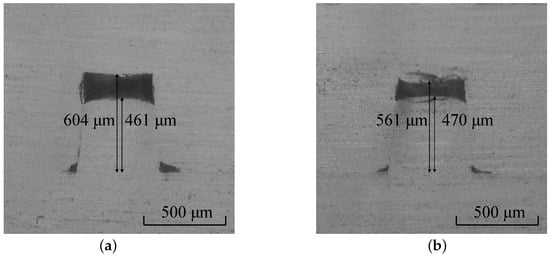 Figure 8a,b show the cross-sections of the products bonded at higher temperatures of 97 °C and 100 °C, respectively. The results indicated that the microchannel collapsed further as the temperature increased. Additionally, the micro-rib was deformed when compared to that shown in Figure 7a. However, the height did not monotonically decrease with the temperature. This was attributed to the squeezing effect in the lateral direction, and this squeezing effect was reflected in the curved profile of the top surface.