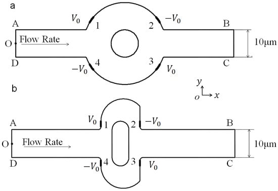 Here, , , and are the magnitude of the velocity of inlet AO, inlet OB, and the normal vector of the surface, respectively. In this work, = = is set. The thicknesses of the electric double layer (EDL) adjacent to the charged channel wall are very thin in comparison to the widths of the channel, and so the Smoluchowski slip boundary condition for Newtonian electroosmotic flow is applied on the charged channel wall AB and CD: