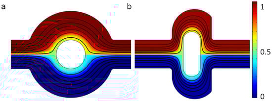 Fluid streamlines in the channel, and the concentration surface plot of (a) the original chip and (b) revised chip in the absence of an electric field and the mean inlet velocity m/s. The unit for the concentration is mol/m.