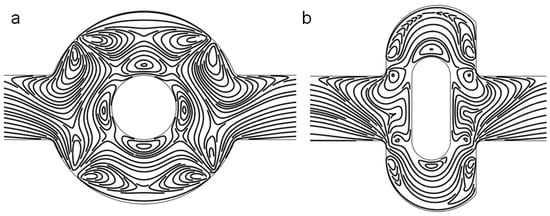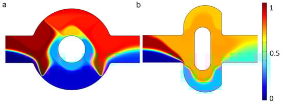We consider a two-dimensional (2D) viscous flow in a microchannel with with a mixing region, as shown in Figure 1b. The channel depth-to-width ratio is assumed to be large enough for the three-dimensional effect of top and bottom to be neglected. The original mixer (shown in Figure 1a as a reference) is composed of two circular boundaries, while the optimized mixer of the present study is composed of two lateral structures, as designed by the authors using a topography optimization method.