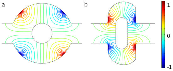 In the present work, we present an EOF mixer with an efficient lateral structure with DC voltage across two coplanar groups of electrodes. The lateral structure is obtained based on the topography optimization method [8,29,30,31]. By adding four electrodes and adjusting their distribution, the channel with DC-EOF produces in-plane microvortices, helping the reagent mixing. Compared with traditional EOF mixers consisting of two circles [10], the efficiency of the proposed EOF micromixer with a lateral structure is significantly improved by the enhanced fluid motion. Besides, the electric field is not time-dependent, but stationary. The proposed mixer can thus be more compact and suitable for connection with other parts of a microfluidic system.