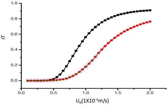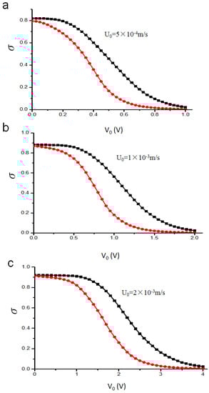 The mixing efficiency index σ versus the potential , where the inlet mean velocity is (a) m/s; (b) m/s; (c) m/s. Black line with square symbols: original chip; Red line with circular symbols: revised chip.