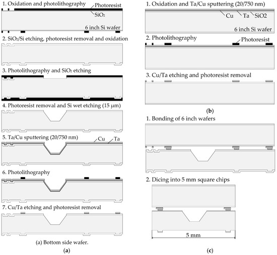 Fabrication process of the sample wafers. (a) Bottom side wafer; (b) top side wafer; (c) bonding and dicing process.