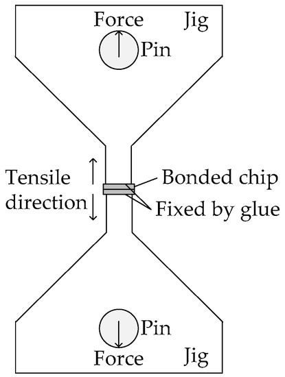The strength of the bonded chips was evaluated by the tensile test. A schematic of the tensile test setup is shown in Figure 3. A bonded chip was fixed to jigs by glue (ethyl cyanoacrylate) and pulled in a vertical direction. Tensile tests were carried out by TIRA test 2805. It should be noted that the measured tensile strength using this setup is not the actual tensile strength of the Cu-Cu bonded interface. Each Si substrate was bended during the tensile test, because the bonding frames were placed on the edge of the chips. Thus, the shear stress on the bonding frames will be increased with the deformation of the Si substrates. In addition, applied stress should be concentrated on the corners of the bonding frames due to the deformation of the Si substrates.