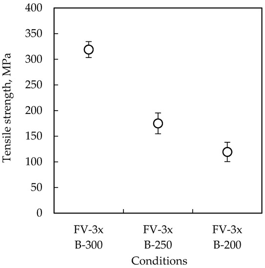 The tensile strengths of the formic acid vapor pre-treated chips at different bonding temperatures are shown in Figure 4. The chips bonded at 300 °C show a bonding strength of 320 MPa, which is at the same level of the bulk Cu-Cu diffusion bonding strength, but much higher than the reported wafer-level Cu-Cu bonding strength in the range of 20–40 MPa [6,16]. It is considered that the actual bonding strength should be lower than the measured strength for the reasons mentioned above. Anyway, the chips bonded at 200 °C and 250 °C were fractured from the Cu-Cu interface, but the chips bonded at 300 °C were fractured from the adhesion layer or the Si substrate. Thus, at least a 300 °C bonding temperature is suggested even if the Cu is not covered by oxide.