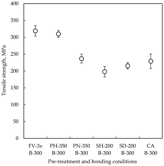 Tensile strengths of the chips bonded at 300 °C with different pre-treatment methods. Nine chips were tested in each condition.