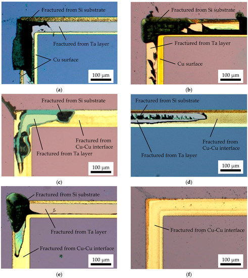 - Chen, K.N.; Chang, S.M.; Shen, L.C.; Reif, R. Investigations of strength of copper-bonded wafers with several quantitative and qualitative tests. J. Electron. Mater. 2006, 35, 1082–1086. [Google Scholar] [CrossRef]