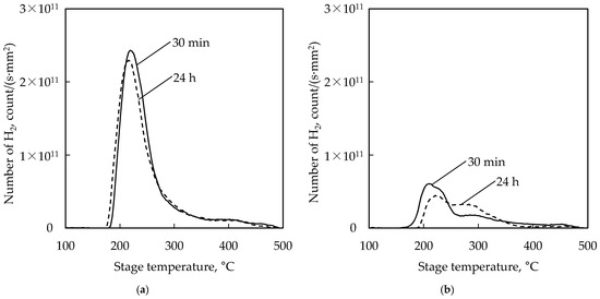 Change of the TDS spectrum with time in the atmosphere. After the treatments, Cu film was exposed to the atmosphere for 30 min and 24 h. The spectra show the H2 desorption rate along with the increasing temperature. The temperature elevation rate was 60 °C/min. (a) H2 desorption spectrum of H2/Ar plasma treated Cu; (b) H2 desorption spectrum of citric acid treated Cu.