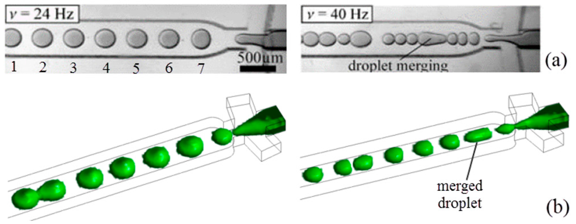 - Sang, L.; Hong, Y.P.; Wang, F.J. Investigation of viscosity effect on droplet formation in T-shaped microchannels by numerical and analytical methods. Microfluid. Nanofluid. 2009, 6, 621–635. [Google Scholar] [CrossRef]