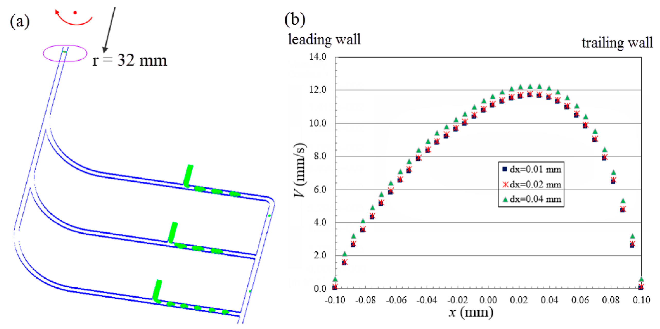 (a) Generation of water-in-oil droplets in the centrifugal microfluidic system when Ω = 20 rad/s. (b) Throughflow velocity profile across the center line of microchannel along transversal direction with different size of mesh grids at downstream located 32 mm from the center of rotation.