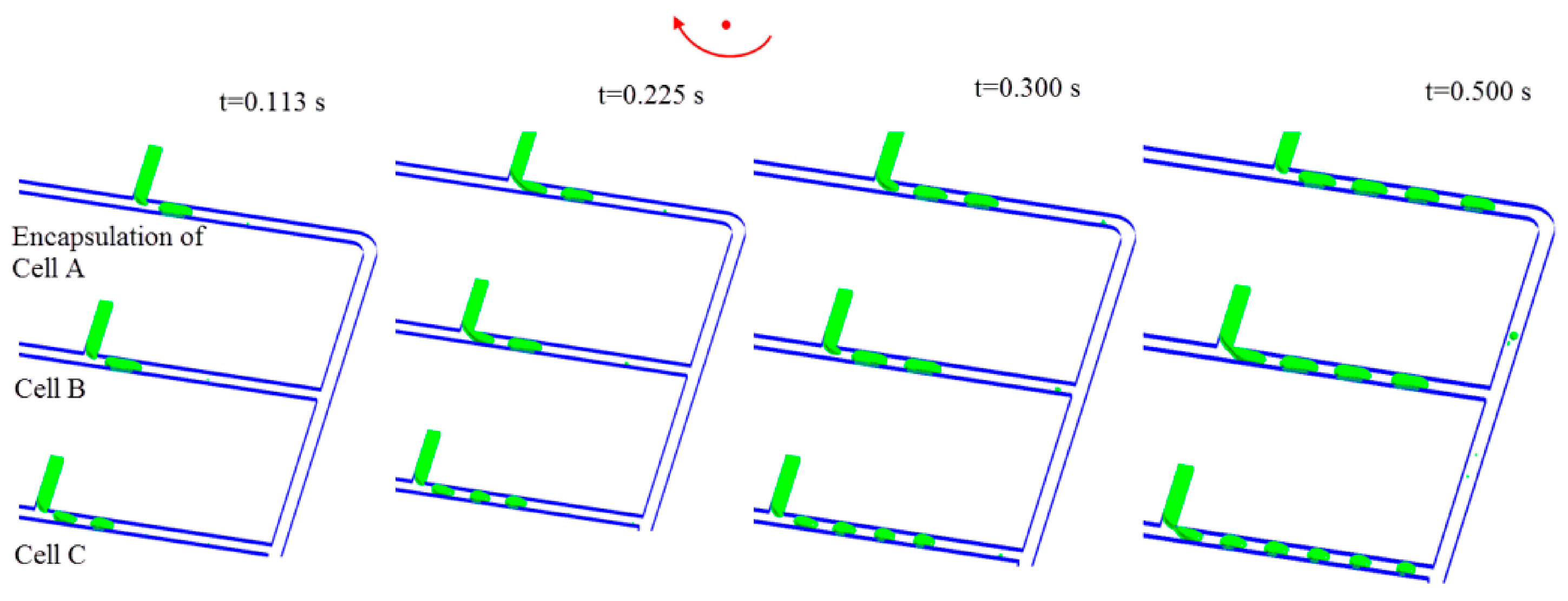 Simulation of encapsulation of multiple types of cells using same centrifugal microfluidic platform. The arrow denotes the direction of rotation. Ω = 50 rad/s.