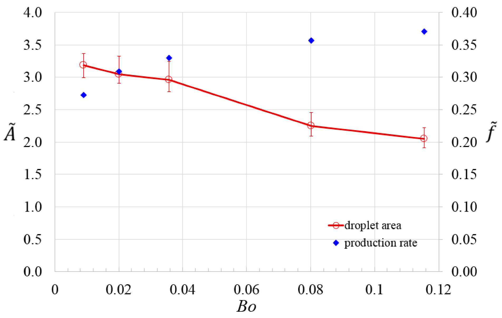 Dimensionless averaged droplet area and dimensionless production rate at different Bond numbers by controlling the rotation speed.