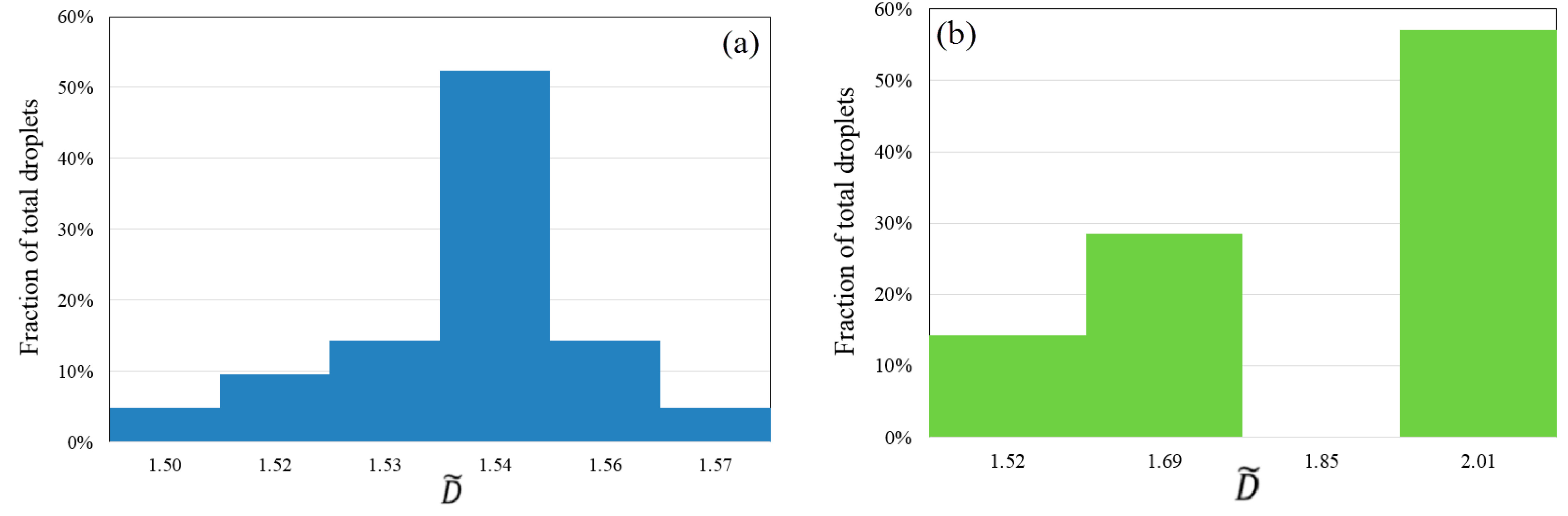 The histogram of size distribution of droplets formed in pre-merging and post-merging regime is shown in Figure 6a,b, respectively. The size of the droplets, D, is evaluated by assuming that the droplets adopt a spherical shape, and is non-dimensionalized by the hydraulic diameter of the microchannel,
