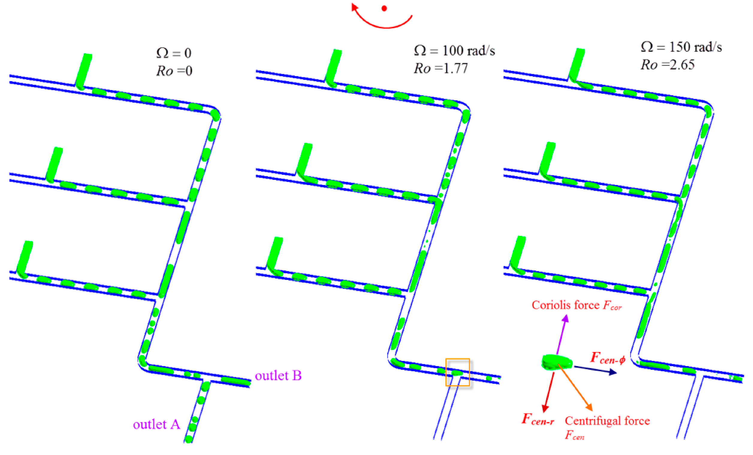 Droplet sedimentation is one of the critical applications in multiphase systems. The ability to control selectively the different phases is shown in Figure 7, using a bifurcated flow-splitting structure (see separation junction in Figure 1b). When the channel is stationary, i.e., Ω = 0, the multiphase water-in-oil emulsion flow is split into two outlet channels due to the nature of pressure-driven flow. In contrast, when the whole system is under rotation, for example, with rotation speed of 100, and 150 rad/s, respectively, the centrifugal force and Coriolis force both act simultaneously on the cell encapsulated droplet, see inset of Figure 7. The centrifugal force can be further resolved into two components, Fcen-φ and Fcen-r. The former will drive the droplet to move along the circumferential direction, while the latter is pointing radially outwards, pushing the droplet to move towards outlet A. Meanwhile, the Coriolis force is generated which is perpendicular to the direction of Fcen-φ, while opposite to the direction of Fcen-r, it attempts to force the droplet against the left wall of the channel along the droplet motion. Consequently, the droplets leave the disk via the outlet B instead of outlet A. As such the governing parameter should be the ratio of the Coriolis force to the centrifugal force, which is the Rossby number, Ro,