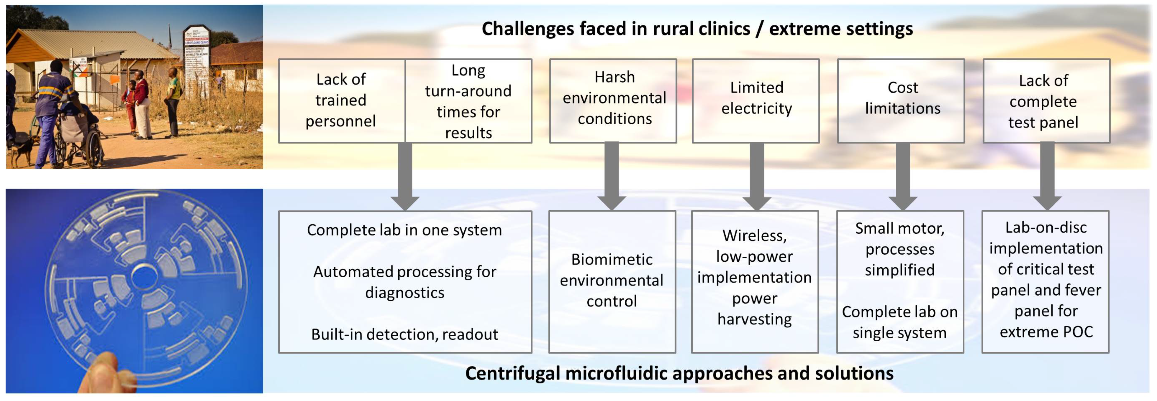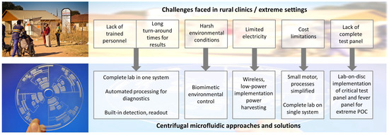 Figure 1 summarizes the various challenges faced in rural clinics in under-resourced settings, with corresponding centrifugal microfluidic technologies and developments. Limitations, such as access to trained staff and laboratory equipment, in extreme settings can be potentially overcome by utilizing an automated, complete lab-on-a-disc centrifugal system, as discussed in Section 4.1. Challenges such as electricity limitations and extreme environmental conditions, such as high temperature, humidity and dust levels, can be targeted through low-power centrifugal system implementations and biomimetic approaches for energy harvesting and environmental control, as outlined in Section 4.2.2 and Section 4.2.3, respectively. The simplicity of implementing centrifugal systems while achieving advanced and diverse functionality enables issues, such as cost and complete test panels, to be addressed. This paper discusses the various challenges faced in extreme POC settings and the potential CD-based microfluidic advances that could assist in formulating solutions.
