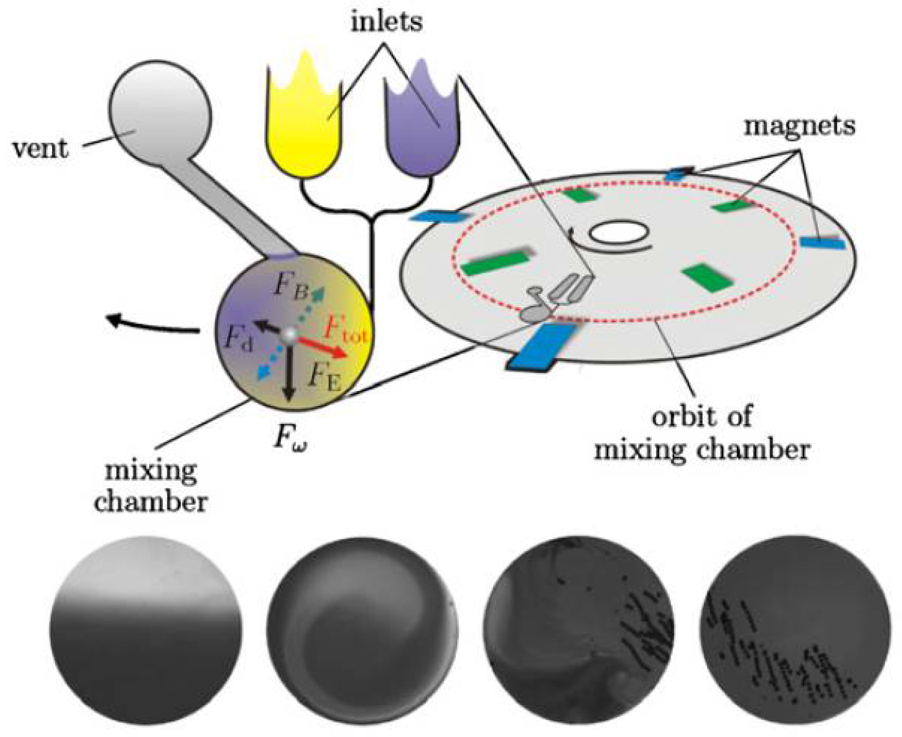 Illustration of rapid mixing techniques in centrifugal microfluidic systems based on the work by Grumman et al. [47], where magnets are used to facilitate mixing. Permanent magnets are aligned on the set-up at radial positions that are inbound and outbound relative to the mean orbit (dashed circle) of the rotating mixing chamber. A magnetic bead inside the mixing chamber is thus exposed to an alternating radial force F and a viscous drag force F, in addition to the centrifugal force F and Euler force F. The bottom row of images shows the flow patterns within the mixing chamber. Image reproduced from [46]. © IOP Publishing. Reproduced with permission. All rights reserved.