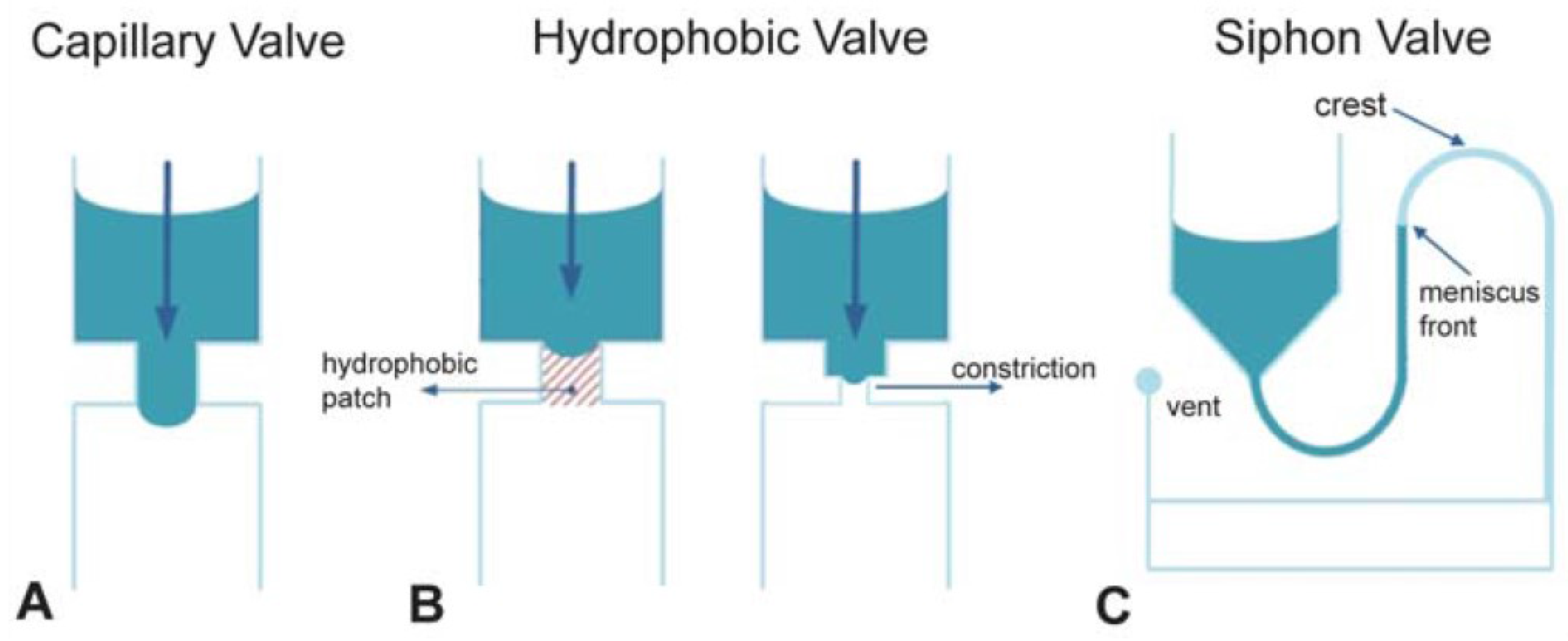 Examples of commonly-used valving techniques in centrifugal microfluidic systems. (A) Capillary valving implemented by a sudden expansion in the channel diameter; (B) hydrophobic valving using either a hydrophobic patch made by applying hydrophobic material to a zone inside a channel or by implementing a constriction in a chamber or channel made of hydrophobic material; (C) siphon valving implemented using a reservoir and an outlet connected by a hydrophilic channel. At high spin speeds, centrifugal forces keep the meniscus front below the crest. When the spin speed is reduced to below a critical value, the channel is primed, and the liquid is transferred as soon as the meniscus passes the crest point. Reproduced in part from [35] with permission of The Royal Society of Chemistry.