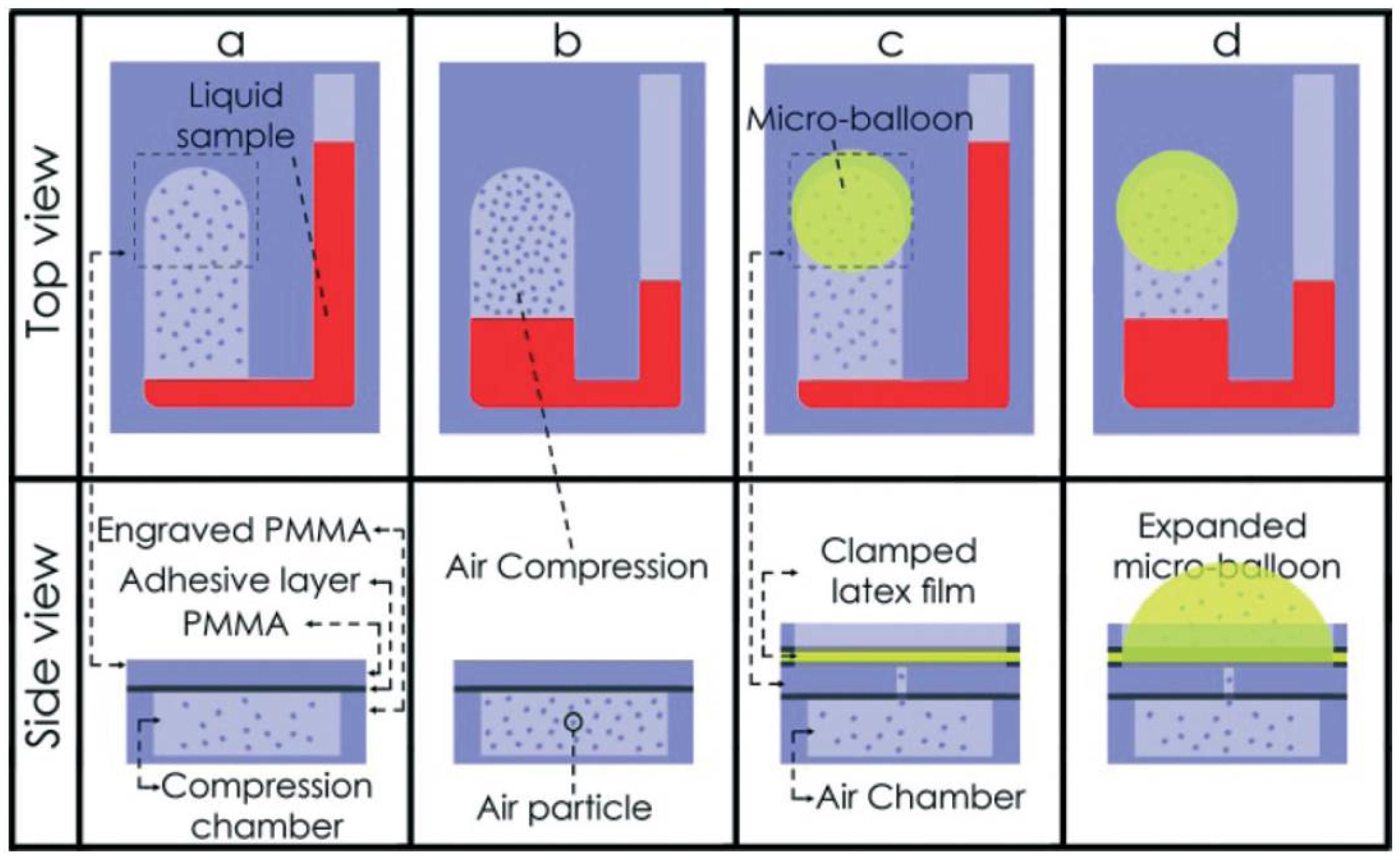 Example of using micro-balloons as flexible walls for effective pneumatic siphon valving in centrifugal microfluidics using lower spin speeds. A comparison is given between standard pneumatic pumping (a,b) and pneumatic pumping with the micro-balloon (c,d). The micro-balloon implementation (c,d) requires a much lower angular velocity than the standard implementation (a,b), which has a higher air pressure at high centrifugal forces. Reproduced from [68] with permission of The Royal Society of Chemistry.