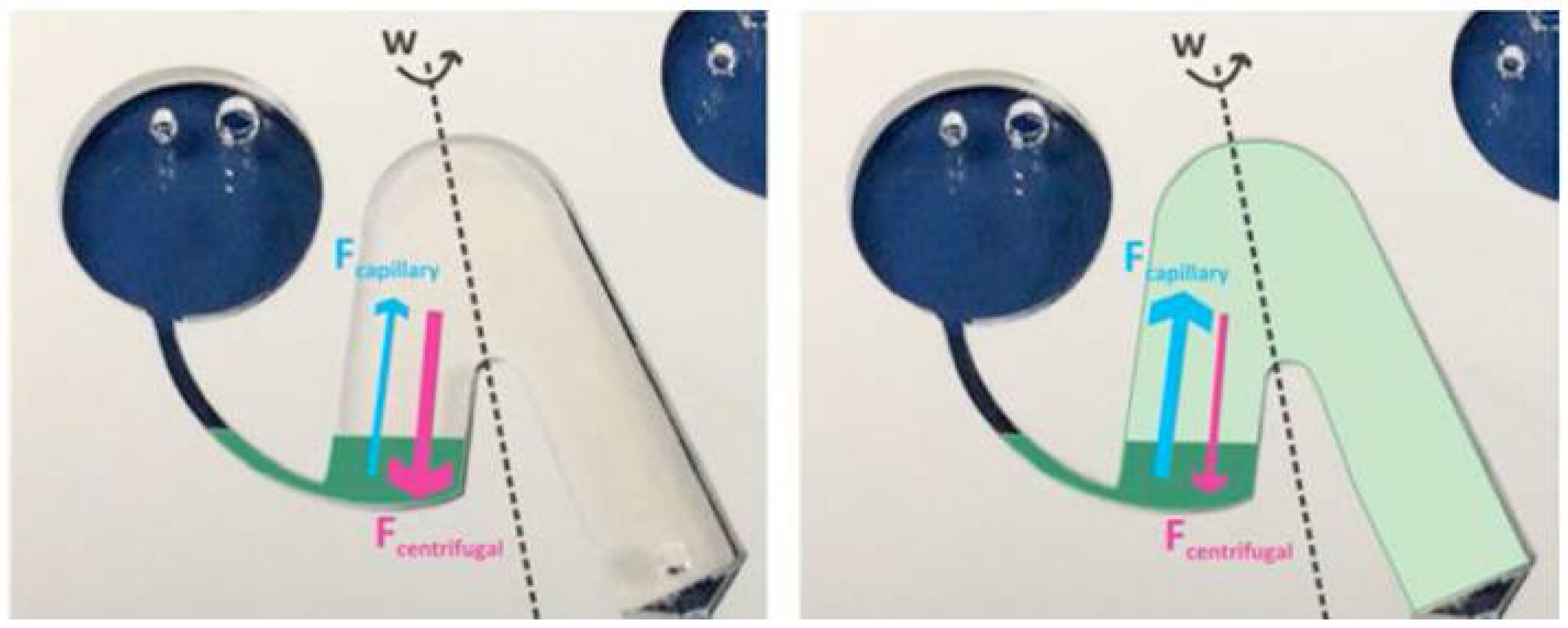 - Zehnle, S.; Schwemmer, F.; Roth, G.; von Stetten, F.; Zengerle, R.; Paust, N. Centrifugo-Dynamic Inward Pumping of Liquids on a Centrifugal Microfluidic Platform. Lab Chip 2012, 12, 5142–5145. [Google Scholar] [CrossRef] [PubMed]