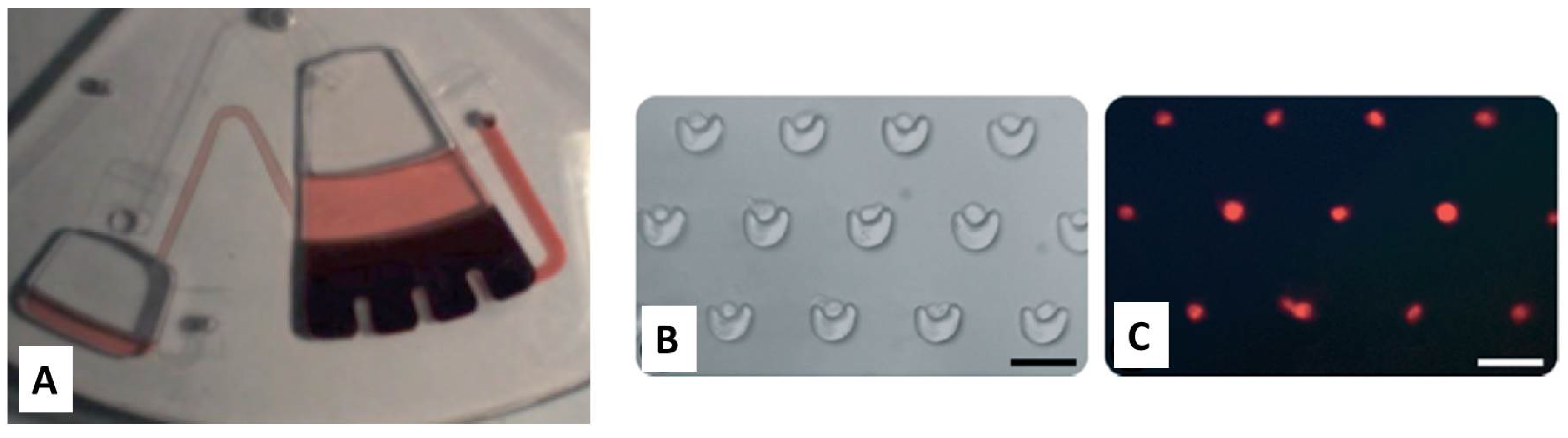 (A) Blood plasma separation on a microfluidic disc from a large sample (>2 mL) of blood. Image reproduced from [85] with permission from Bioanalysis as agreed by Future Science Ltd. (B) Brightfield microscope image of individual HL60 cells captured in V-cup arrays; and (C) fluorescence imaging of the labeled cells. Scale bar = 50 μm. Reproduced in part from [94] with permission of The Royal Society of Chemistry.