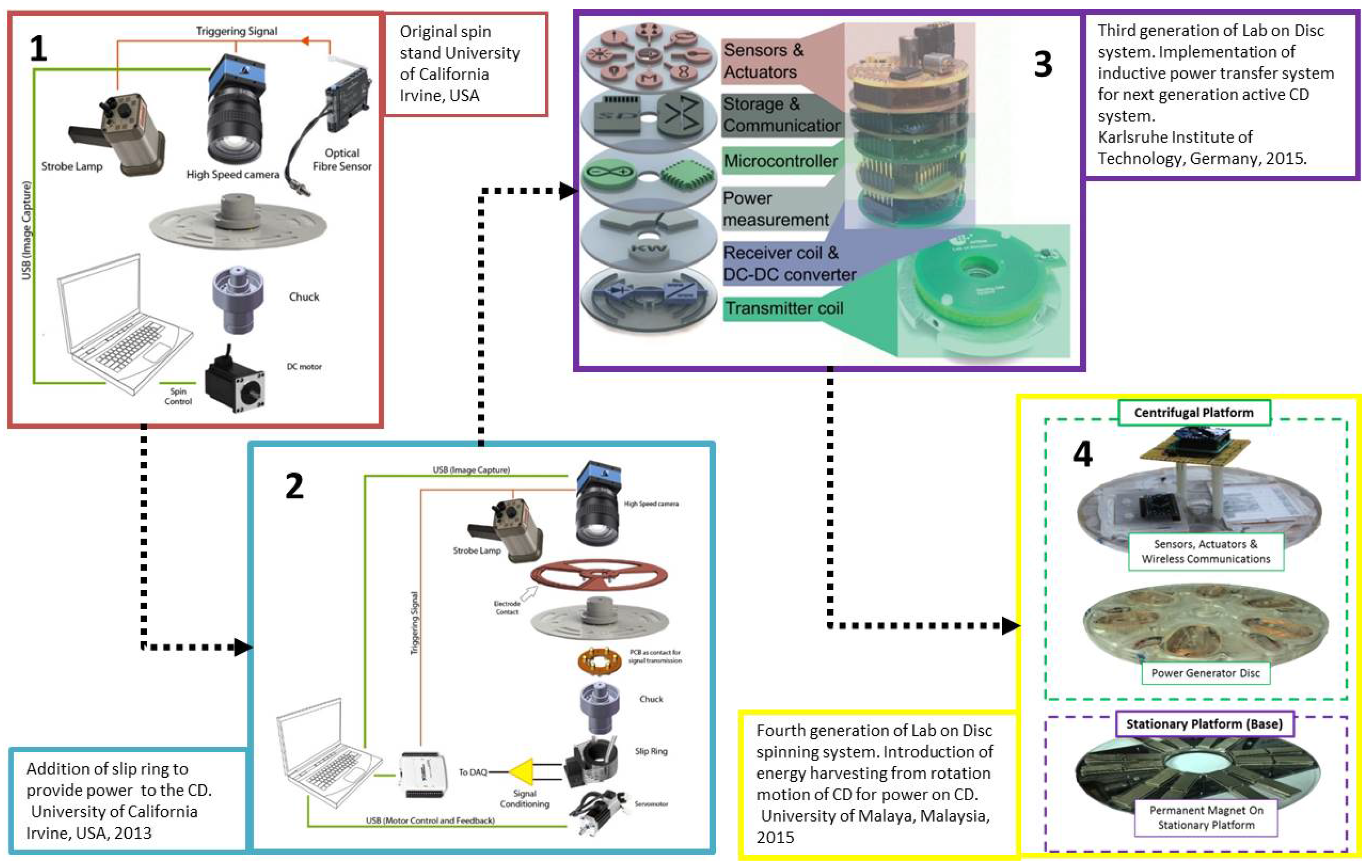 In addition to their functional blocks that are advantageous over existing microfluidic techniques for POC applications, CD-based systems can emulate existing standard laboratory equipment. CDs are traditionally played using a Discman® (Sony Corporation, Tokyo, Japan) or a CD-ROM, and this surrounding CD infrastructure, including a servo-motor for spinning the disc, a laser and lens system on the “pick-up” head for optical detection and a tracking system, which moves the laser to different radial distances along the disc, can be viewed as an all-in-one lab: An integrated system that can perform a number of standard laboratory procedures. In addition, CD-based microfluidics utilize low-cost consumables, commonly in the form of polycarbonate disposable discs, which are well-suited for performing various lab tests. Different laboratory equipment functions that can be realized by centrifugal microfluidics and their surrounding infrastructure are discussed in the following paragraphs and are summarized in Table 1.