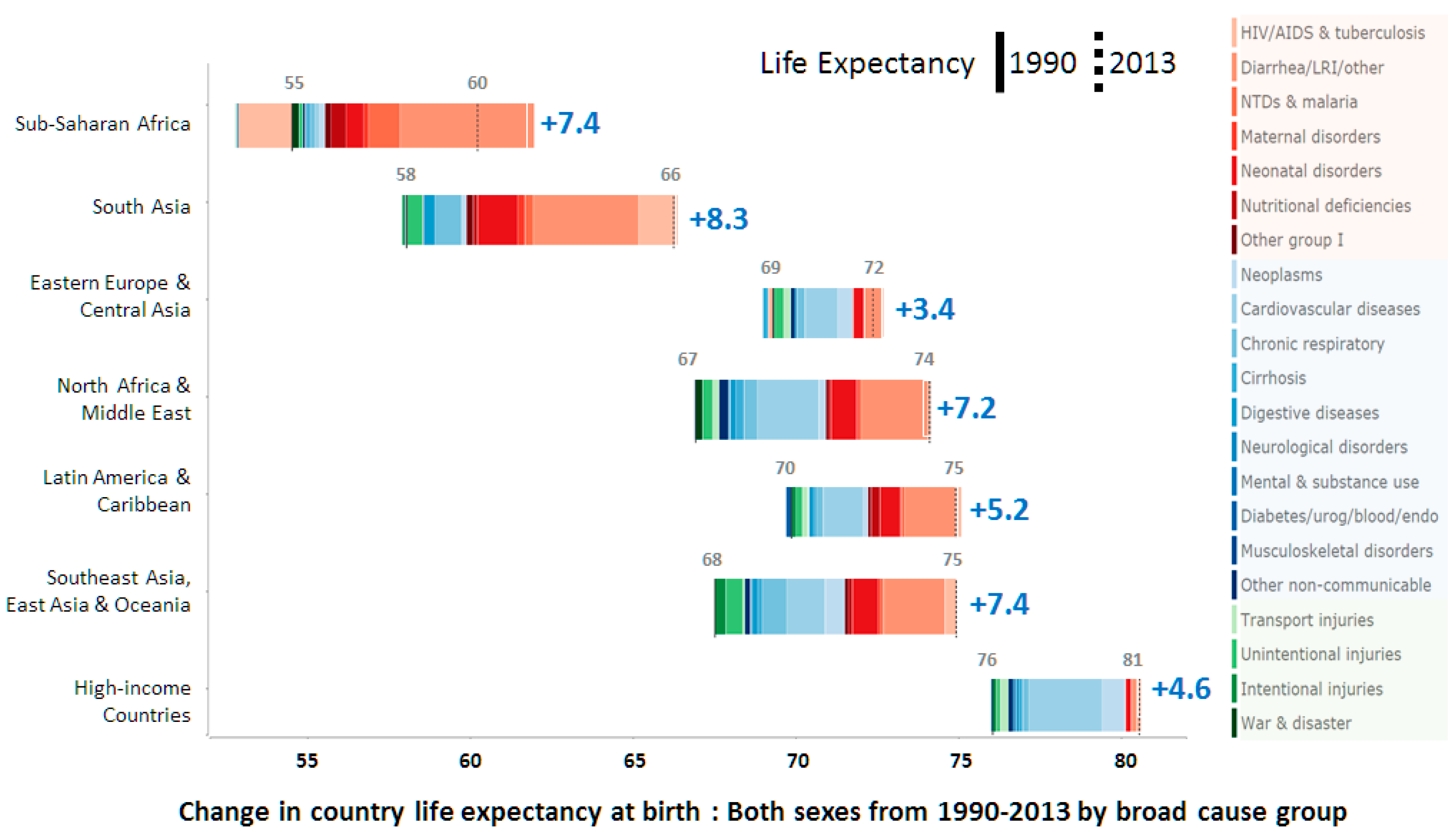 Life expectancies at birth in 1990 and 2013 for both sexes and different causes of life expectancy variation in different regions [26].