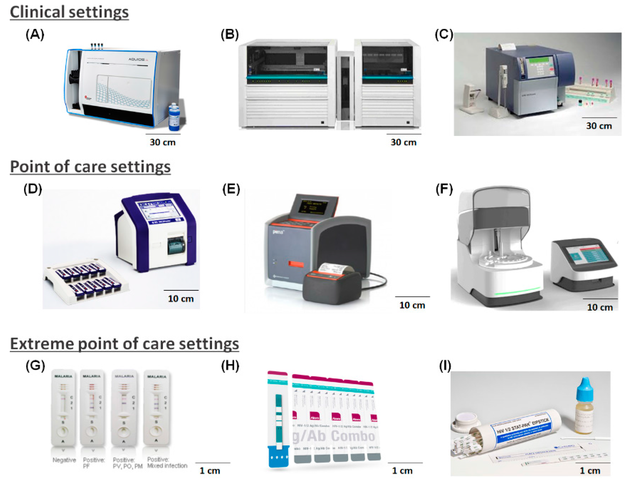 Examples of IVD technology in different treatment settings. Clinical settings: (A) Aquios CL flow cytometer (Beckman Coulter, Inc., Brea, CA, USA) for CD-4 testing; (B) COBAS® AmpliPrep/COBAS® TaqMan® HIV-1 Test, v2.0, (Roche Diagnostics, Indianapolis, IN, USA); (C) BD FACS Count Instrument with Kit (Absolute CD4+, CD8+, and CD3+ Counts), (BD Biosciences, San Jose, CA, USA). POC settings: (D) BD FACSPrestoTM (BD Biosciences, San Jose, CA, USA); (E) Pima CD4 Test (AlereTM, Waltham, MA, USA); (F) Samba II (DRW (US) Ltd., Sunnyvale, CA, USA), approved in a few African countries, yet to be certified by the World Health Organization (WHO). EPOCT settings: (G) CareStart™ Malaria RDT (Access Bio Korea, Inc., Seoul, Korea); (H) Alere Determine HIV-1/2 Ag/Ab Combo (AlereTM, Waltham MA, USA); (I) HIV 1/2 STAT-PAK® dipstick Assay (ChemBio Diagnostics sytems, Inc., Medford, NY, USA) [38,39].
