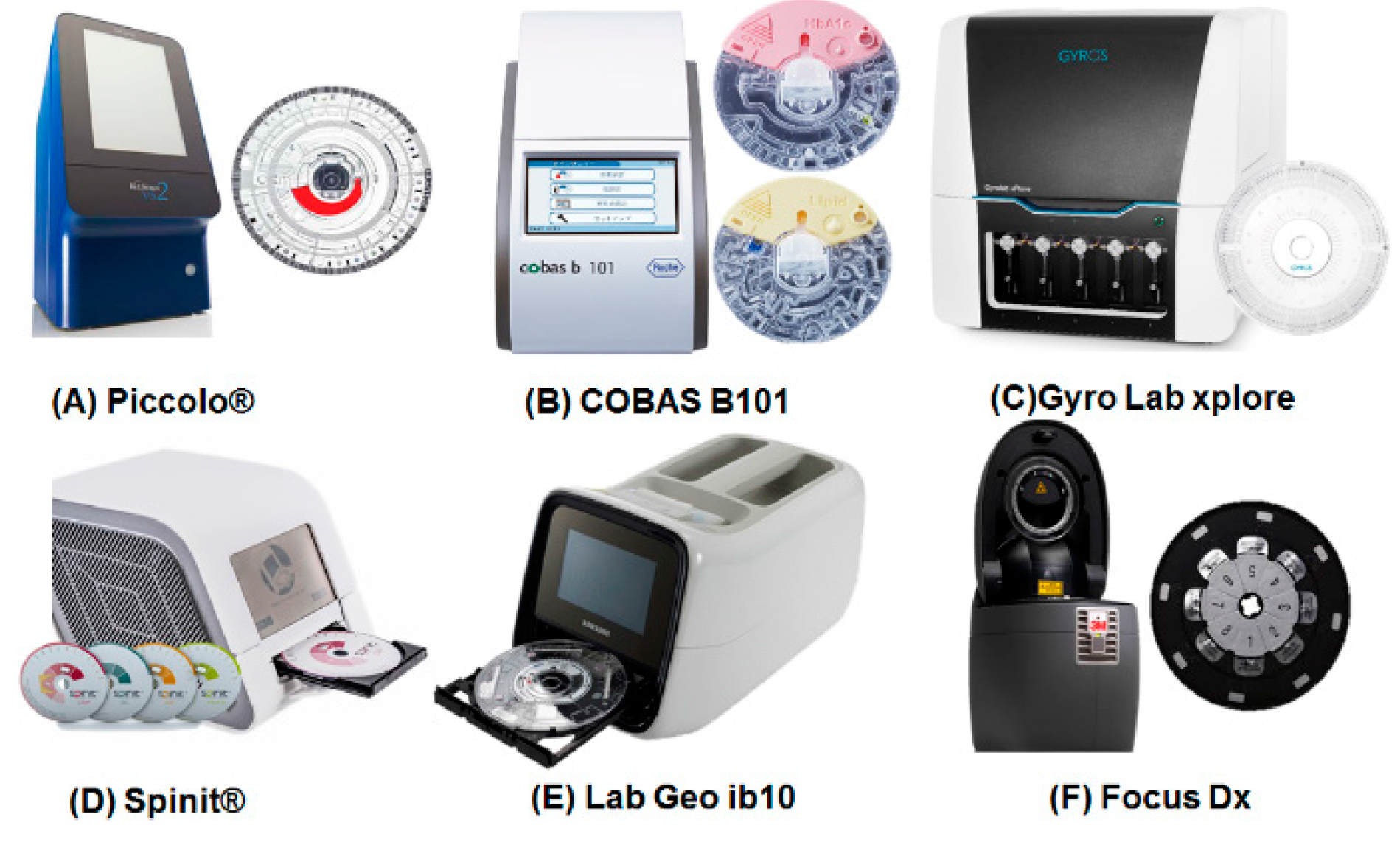 Examples of centrifugal microfluidic-based diagnostic devices for POCT settings: (A) Piccolo® by Abaxis (Union City, CA, USA); (B) COBAS B101 by Roche Diagnostics (Indianapolis, IN, USA); (C) Gyro Lab Explore by Gyros (Uppsala, Sweden); (D) Spinit® by Biosurfit (Lisboa, Portugal); (E) LAB GEO ib10 from Samsung healthcare (South Korea); (F) Focus Dx (Quest) by 3M (Cypress, CA, USA).