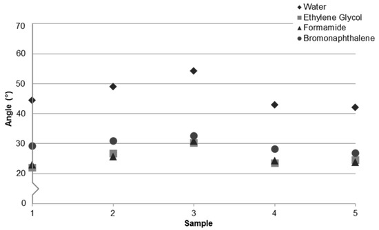 Chemical contamination of the substrates or solutes in the test liquids can affect wetting; however, these effects, if present, would be consistent across measurements, leading to both an increase in and a broadening of observed angles [47]. To determine if contamination was the primary factor giving rise to contact angle variance, the samples were rinsed in ethanol after cleaning to coat the substrates with organic residues. This led to an increase in average contact angle for each sample but no change in the relative range of measurements.