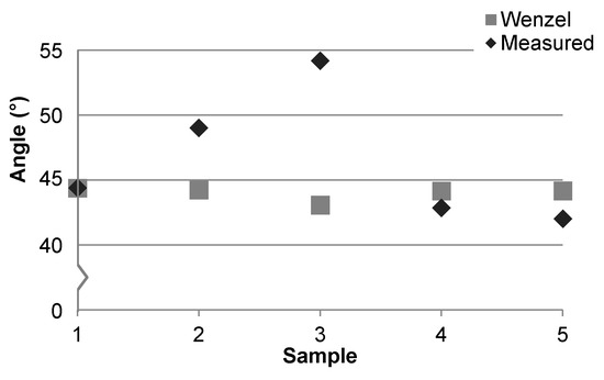 In a second test, the samples were heated to 125 °C for 24 h after cleaning to evaporate physisorbed water and contaminants that may have been left after cleaning. This led to a decrease in average contact angle but no change in variance. Therefore, cleanliness is unlikely to be the main contributor to measurement deviations, since the average observed angle could be increased without broadening the data range when contaminants were added. Likewise, the average contact angle could be lowered without narrowing the relative range of measurements after evaporating surface water and potential contaminants. If the sample preparation were inadequate and contamination was the dominate factor in average contact angle range, it is unlikely that the range would be unaffected by substantial changes to the cleaning procedure.