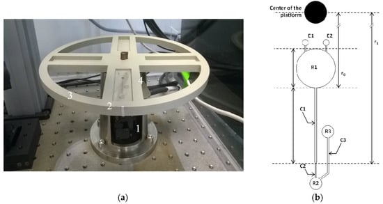 Figure 1. (a) Centrifugal microfluidic platform including: 1 the rotor securely affixed onto 2 an aluminum chuck, 3 the machined PEEK (PolyEtherEtherKetone) holding platform, and 4 the inserted microchip; (b) Design of the microchips (7 cm × 2.2 cm): C1 ion-exchange column, C2 restriction channel, C3 vent channel, R1 injection reservoir, R2 collection reservoir and chromatographic connection, R3 vent and chromatographic connection, E1 entry port, and E2 vent port of the injection reservoir, from [15].