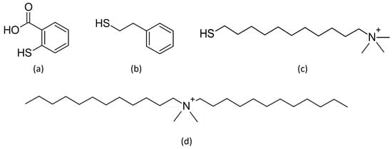 Figure 2. (a) Thiosalicylic acid; (b) 2-phenylethanethiol; (c) (11-Mercaptoundecyl)-N,N,N-trimethylammonium; (d) didodecyldimethylammonium.