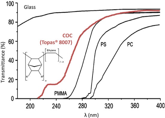 Figure 3. Comparison of the optical transmission of the COC (Topas®-8007, TOPAS Advanced Polymers, Frankfurt-Höchst, Germany) with other thermoplastics commonly used in microfluidics taking glass as Reference [18] (chemical Structure of the Topas COC), sheets of 2 mm thicknesses. PMMA: polymethylmethacrylate, PS: polystyrene, PC: polycarbonate.