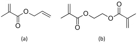Since their introduction in the early 1990s [19], polymethacrylate monoliths have emerged as a powerful alternative tool in chromatographic column technology. Methacrylate polymers are widely used in very different fields such as separation of benzene derivatives [20,21,22], peptides [21], or proteins [23]. They are also used to separate small molecules [24] or atoms in hard medium as shown in a previous work [15]. The combination of their singular porous properties, the various chemistries available and their relatively simple implementation in columns with small internal diameters make them particularly attractive for the new chromatographic challenges of complex matrices analysis [25] or on-chip separations chromatography [26]. Moreover, methacrylate polymerize under UV radiation at 365 nm, i.e., at a wavelength that is compatible with the use of the COC [25]. This widely used way of polymerization allows a localization of the polymerized area thanks to the use of a mask [27,28]. The monolith is composed of two monomers: the crosslinker provides the polymeric network and the functional monomer leads the surface reactivity. So the monolith could be adapted to the functionalization method and the analytical separation needed by a simple change in the monomer mixture. EDMA (Figure 4b) is a currently used crosslinker [20,22,29] because of its stability and ability to create a homogeneous network with other methacrylate monomers [30]. EDMA was chosen as crosslinker in this study. The functional monomer AMA (Figure 4a) was selected because of the interesting reactivity of the carbon double bond which enables a wide scope of chemical reactions especially in the field of click-chemistry.