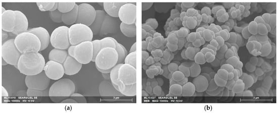 Figure 5. MEB pictures (×10,000) of two monoliths synthetized with different experimental conditions. (a) Monolith a: 7 wt % water, 18 wt % 1,4-butanediol, 35 wt % 1-propanol, 10 wt % EDMA, 30 wt % AMA, 1 wt % DMPA, polymerization time 13 min 20 s; (b) Monolith b: 1 wt % water, 24 wt % 1,4-butanediol, 35 wt % 1-propanol, 24 wt % EDMA, 16 wt % AMA, 1 wt % DMPA, polymerization time 10 min.