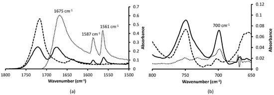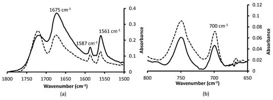 Figure 8. FTIR-ATR spectra of functionalized monolith focused on bands of interest. (a) Thiosalicylic acid; (b) 2-phenylethanethiol; dashed line: fresh functionalized monolith; solid line: functionalized monolith after 24 h in contact with [HNO3] = 8 mol·L−1.