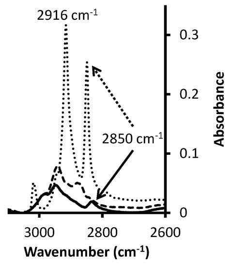 Ammonium thiol was then grafted as can be seen in Figure 7. 2916 and 2850 cm−1 are characteristic bands of –CH stretch vibrations of –CH2– groups [48,49] of the (11-Mercaptoundecyl)-N,N,N-trimethylammonium molecule.
