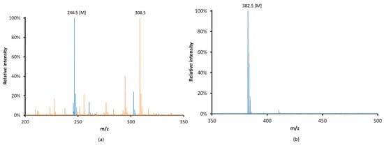 Figure 9. Mass spectra of M (a) (11-Mercaptoundecyl)-N,N,N-trimethylammonium and (b) didodecyldimethylammonium after contact with [HNO3] = 8 mol·L−1; blue line: tcontact = 0; orange line: tcontact = 24 h.