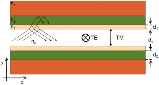 ARROW waveguides enable light confinement and propagation thanks to interference phenomena occurring in the cladding structure, made up of alternating high- and low- refractive index (RI) thin layers. The working principle of an ARROW waveguide can be easier understood by considering a schematic one-dimensional structure, as shown in Figure 1. For simplicity, we consider only two cladding layers with refractive index n1 and n2 (n1 > n2). Light propagates through the core by means of Fresnel reflections at the cladding interfaces. The entrapped light in each cladding layer experiences interference due to repeated reflections at cladding interfaces. In order to intensify the light reflected back into the core, each interference cladding must be designed to fulfill a specific condition. By considering the analogy of a cladding layer with a Fabry–Pérot cavity, such condition corresponds to the anti-resonance state of the cavity, which performs the maximum reflectivity. The reflectivity of the multilayer stack constituted by multiple interference claddings, generally called Fabry–Pérot mirror, can be very high, up to 99%.