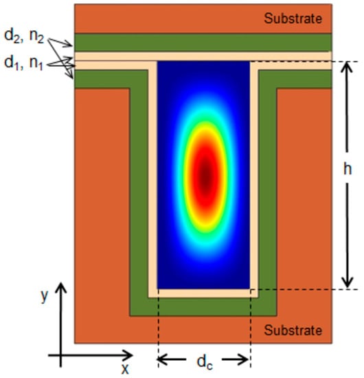 where β0 = 2π/λ, β is the propagation constant, nc and dc are the refractive index and the thickness of the core, respectively. If λ/dc << 1 (e.g., large core waveguides), Equation (2) can be simplified to neff ≈ nc. As long as the operating wavelength and the core and cladding materials are conveniently chosen, reduced propagation losses can be obtained by using Equations (1) and (2) to calculate the cladding thickness.